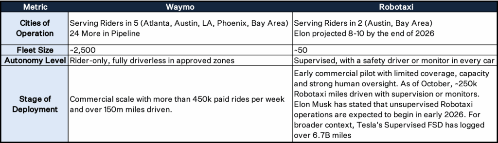 To keep the comparison clean, it helps to focus on three shared metrics: cities, fleet size, autonomy level, and deployment stage: