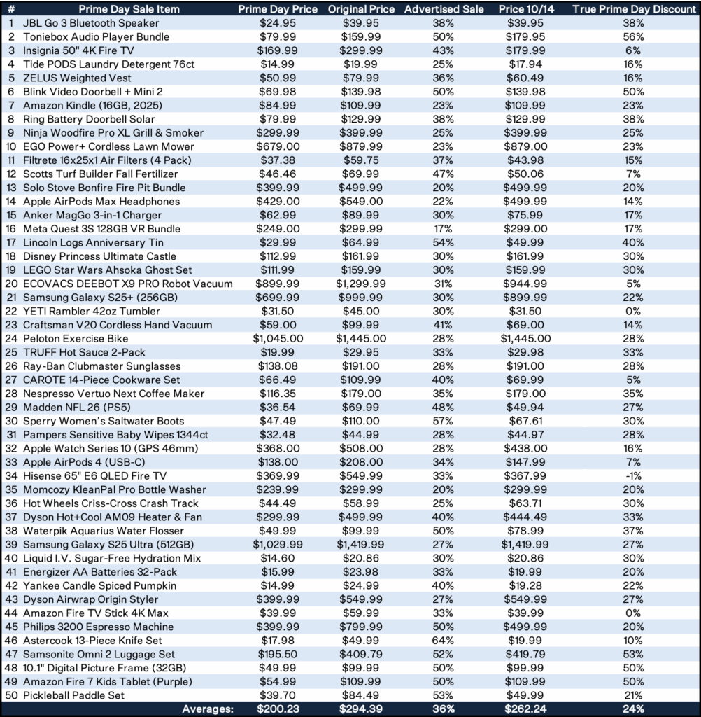 We looked deeper into Prime Day deals (October) on Amazon and tracked 50 items across a wide spectrum located in their “Prime Day Deals” section. These items ranged from a JBL Bluetooth Speaker ($25) to a Samsung Galaxy S25 Ultra ($1,030) to a LEGO Star Wars Ahsoka Ghost Set ($111). Our goal was to examine sale price, discount percentage, and the original price. The average Prime Day discount compared to the “original price” across the 50 items tracked was 36%.