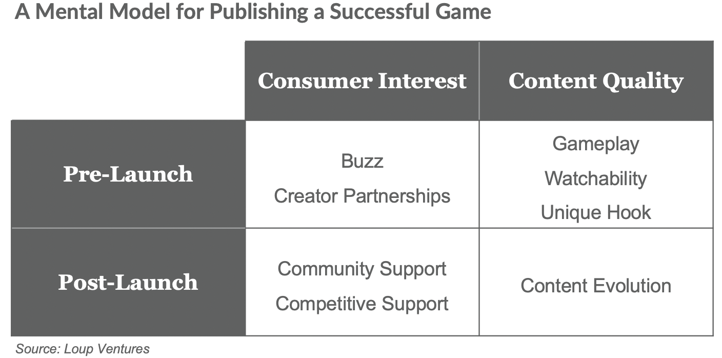 For a game to be a success, the quality of the game must exceed player expectations. This is particularly true for free-to-play games, as gamers don’t feel there is a sunk cost of a $60 upfront payment to keep playing. There are three components to content quality pre-launch: gameplay, watchability, and a unique hook.
