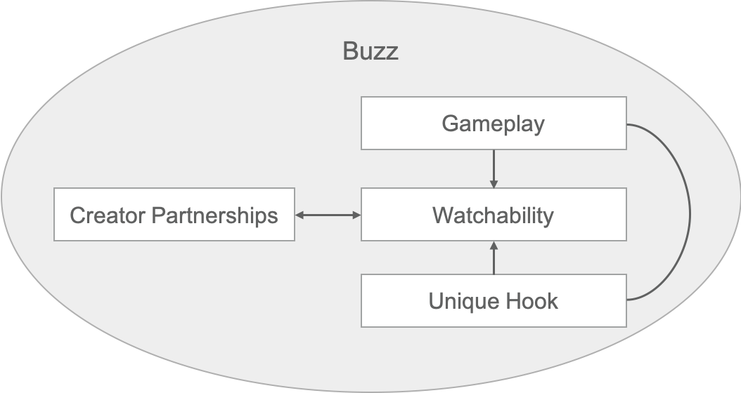 Gameplay and the unique hook are inextricably intertwined as the core components of the gaming experience for the player. Both serve to build a base for something that is watchable to non-players, and watchability is the desirable factor of a game for creators who want non-players to watch them play. All of this combines to create buzz for the game that results in a successful launch.