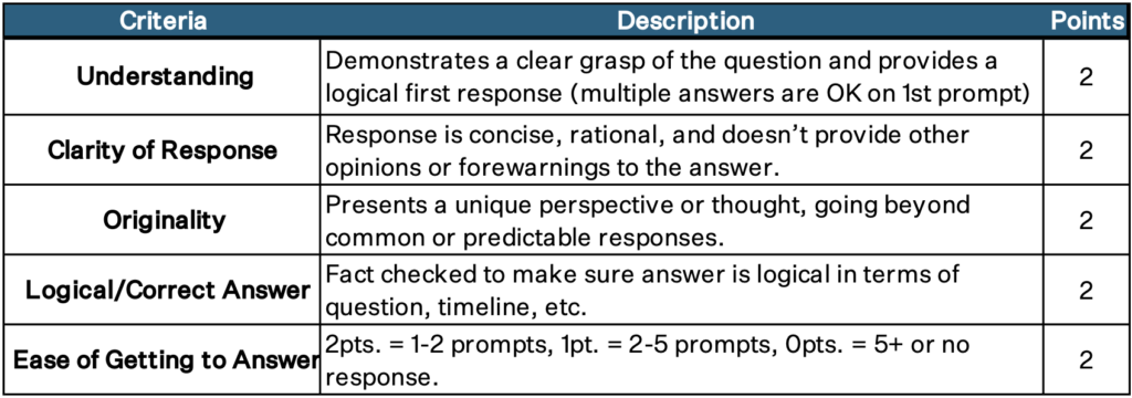 Criteria: Responses were graded on the following criteria for a maximum score of 10 per query: