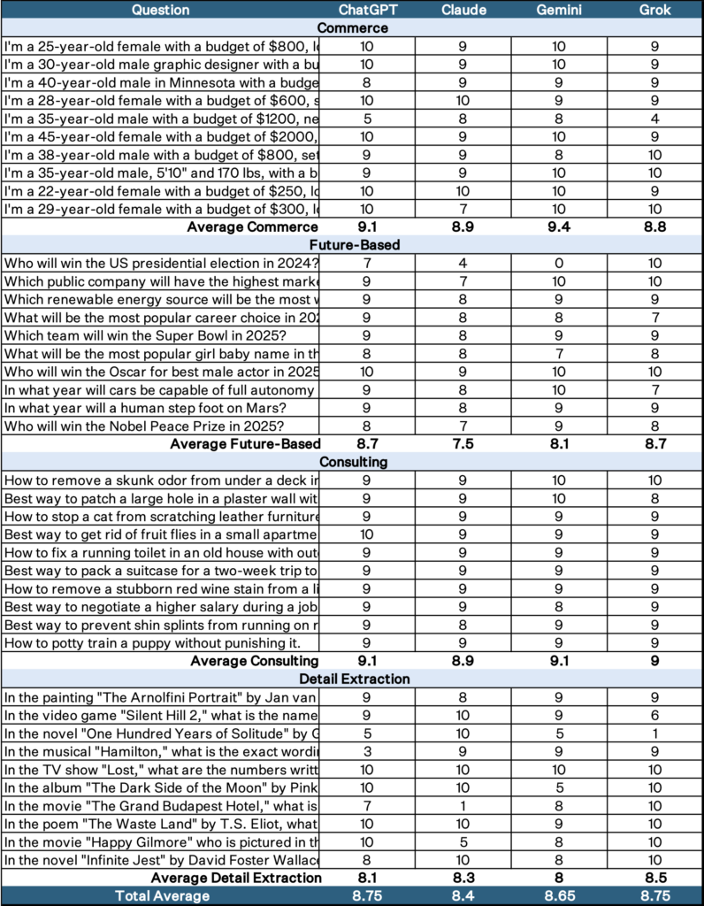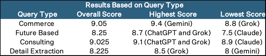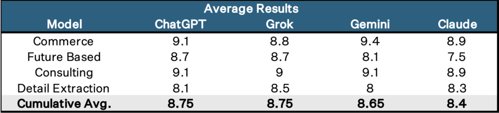 Our Approach: We tested the four leading generative AI models; OpenAI’s ChatGPT, Anthropic’s Claude, xAI’s Grok, and Google’s Gemini. The same 40 questions were prompted across 4 categories: Commerce, Future Based, Consulting, and Detail Extraction. The objective was to get the model to give a definitive answer to the prompt to score full points. Multiple prompt attempts and framing strategies are used to get an acceptable response.