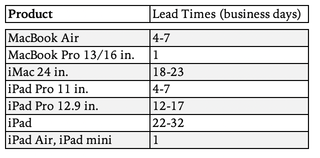 Demand for Mac and iPad over the past 12 months has been strong, propelled by the digital transformation and work- and learn-from-anywhere tailwind. On Apple’s March earnings call, management guided to a $3-4B combined headwind for these two segments in the June quarter due to supply constraints, noting, “we expect to be supply gated, not demand-gated.” Our spot check of Apple lead times suggest the company was right, and that demand is still outpacing supply as we exit the June quarter. Net net, we see the positive demand tailwind as much stronger and more sustainable than any supply headwinds. Estimated delivery dates for some iPad and Mac models are more than a month out: