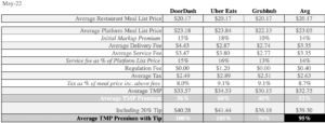 A second takeaway from our survey was related to the premium that consumers pay for using food delivery services. The average premium increased from 82% in March to 95% in May, including a 20% tip. As mentioned, the key factor in the premium increases is related to delivery and service fees jumping by 77%. In other words, you’re paying about 2X the normal price of a meal when you order through a food delivery service.