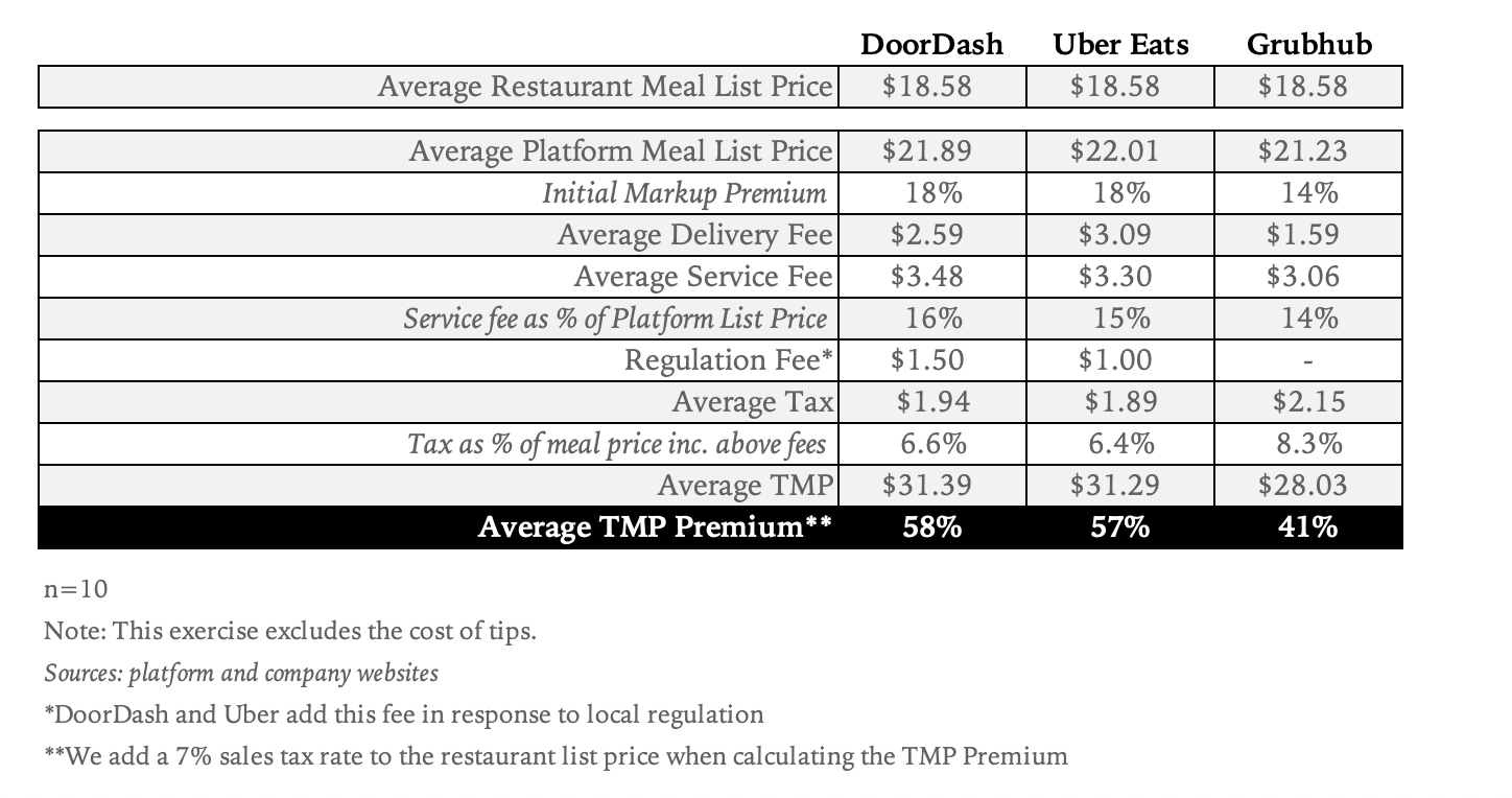 Putting it together, the average TMP premium ranged from 41% on Grubhub to 58% on DoorDash.