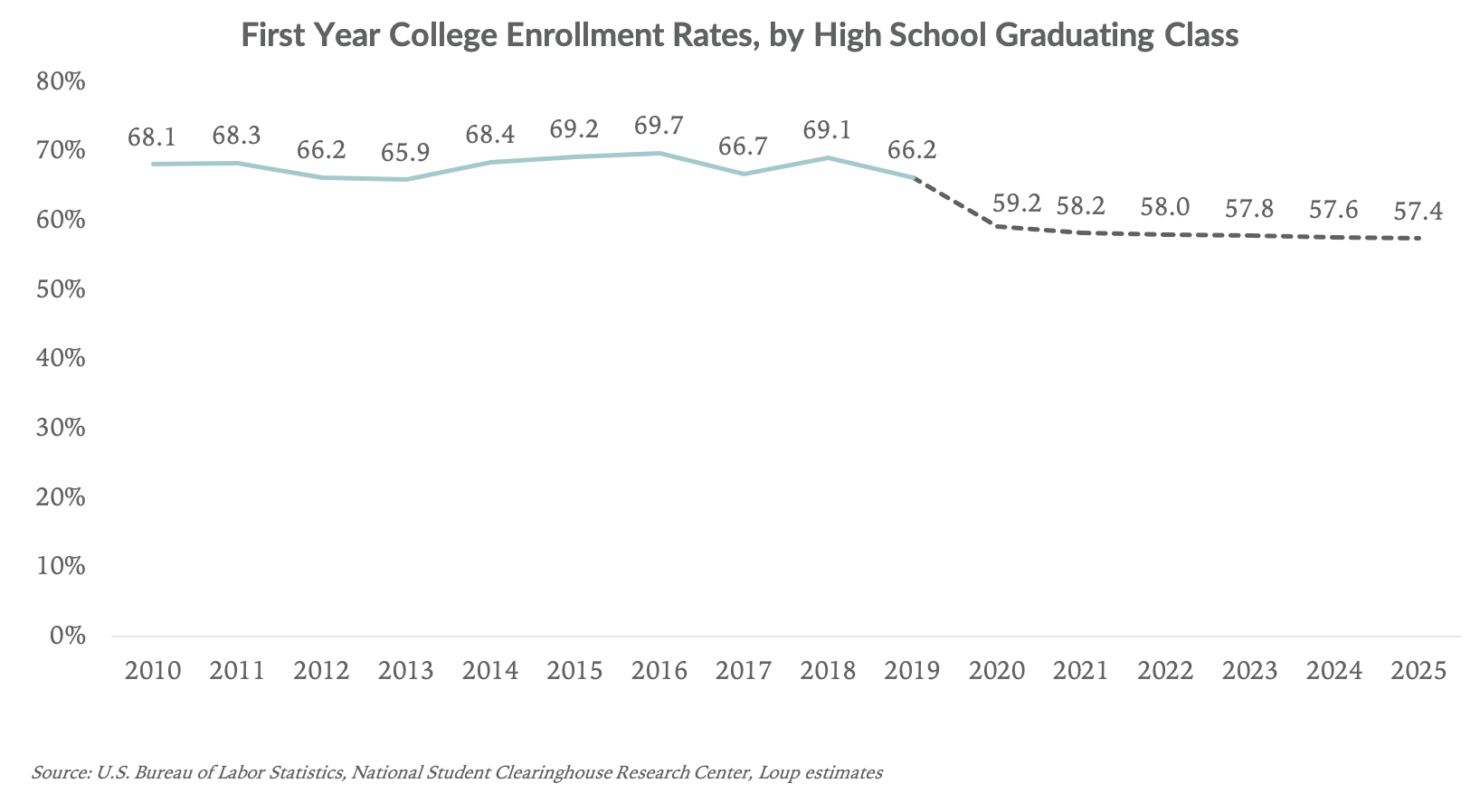 With this backdrop, we believe the higher ed space is ready for disruption, given a confluence of factors. First, there is long-standing skepticism among students and parents about the value of a college degree, which has been accentuated by the pandemic. Second, young adults are looking for ways to hack higher ed, through outlets such as YouTube (ask a student if they use YouTube to help with homework) and Khan Academy, as well as work-education alternatives that provide students an income while they earn a degree. Putting it together, we believe college enrollment rates will stabilize over the next five years between 57% and 60%, down from the 65%-70% range over the past decade. Beyond five years, we anticipate further fractional annual declines in college enrollment rates. That creates an opportunity for companies to step in and fill the accreditation gap.