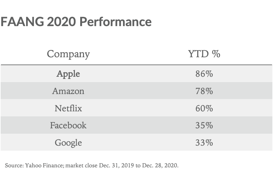 1. Apple will be the top-performing FAANG stock in 2021. This is the third consecutive year we’ve made this prediction. In 2019, Apple was the top performer, and the stock is set to repeat in 2020. We think Apple will come out on top again in 2021 based on four factors: