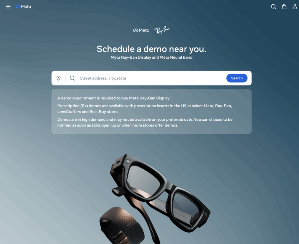 Meta’s sales model for its Display glasses reveals that users need to be fitted with both the glasses and the Neural Band. As stated on the first line of the Meta Display landing page, “A demo appointment is required to buy Meta Ray-Ban Display.”