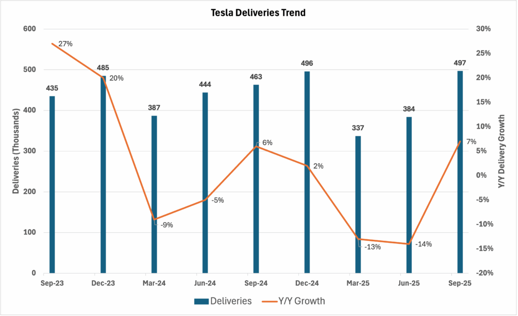 Deliveries of 497k raced past a 470–475k whisper range. The sell side had been raising numbers throughout the month of September, starting at around 440k, due to a combination of the success of the tax credit pull-forward and improvements in China.