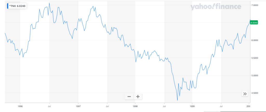 First, zero rates help form widespread asset bubbles like the Everything Bubble of 2020-21, but they are not a necessary condition for a technologically driven asset bubble. Between 1995-2000, the lowest 10-year yield was around 4.4%, not far from where we are now. The 10-year spent much of the early-to-mid part of the Dotcom bubble above 5.5% and even spent some time around 7%.