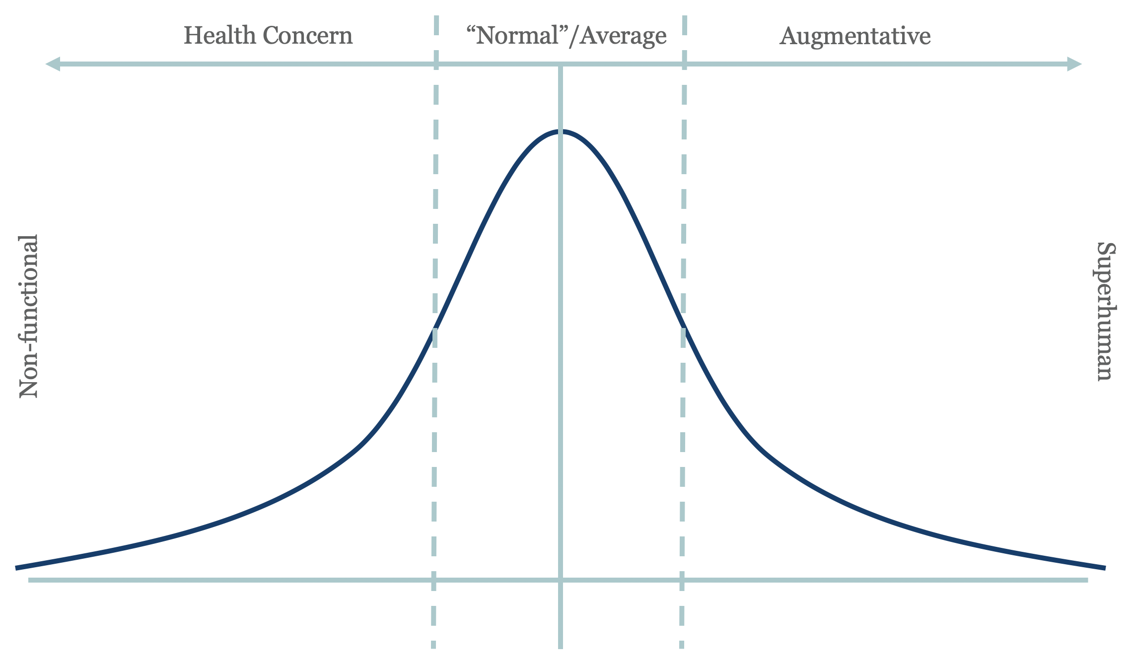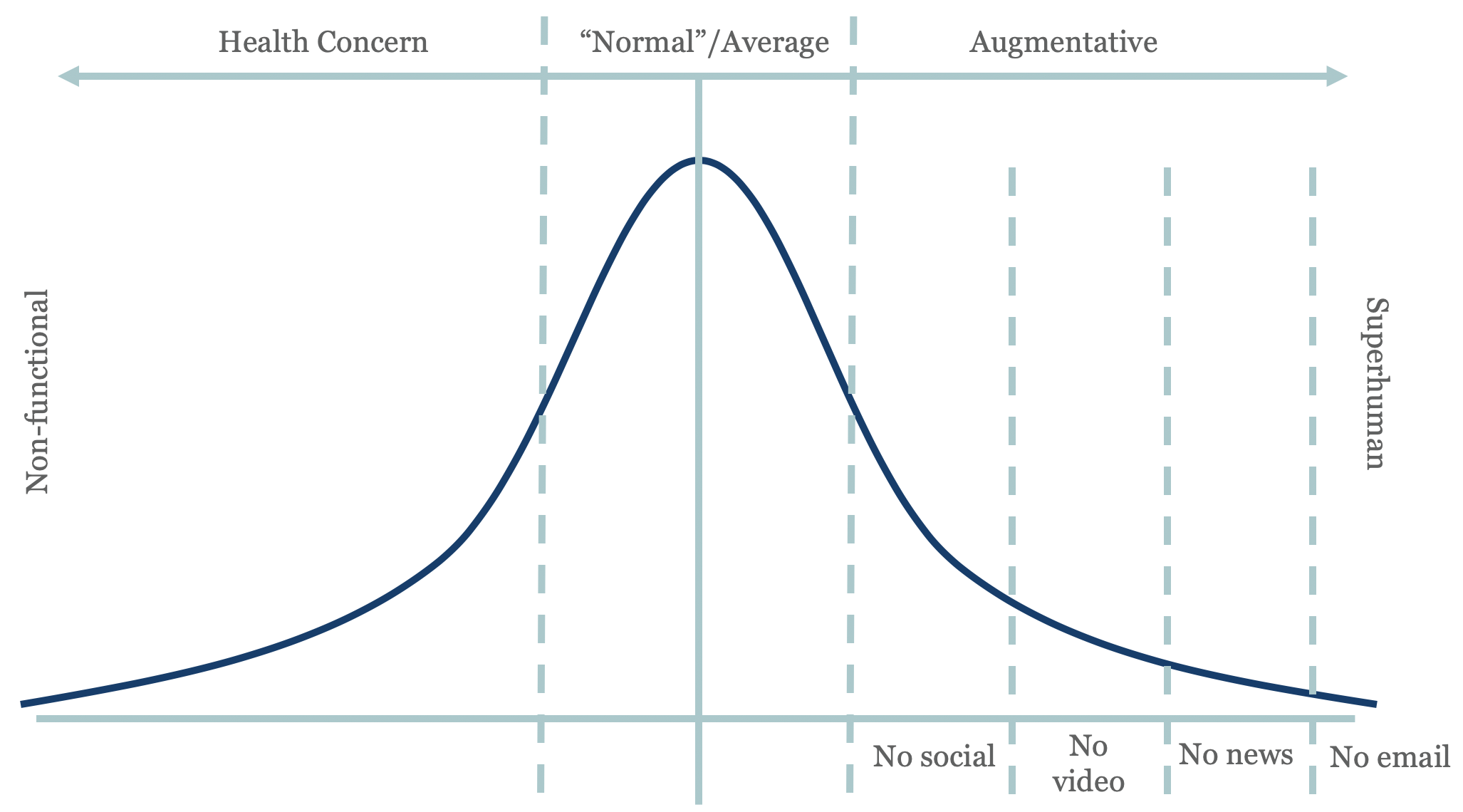 A minority of tech users will voluntarily limit device and software use for health and performance benefits. When we tested the Good Phone (a distraction-free iPhone), the power of minimal tech became very apparent to us: we were able to focus better, felt more creative and relaxed, and we got more important things done. We felt superhuman, which is an apt description relative to both the left and middle parts of the curve.