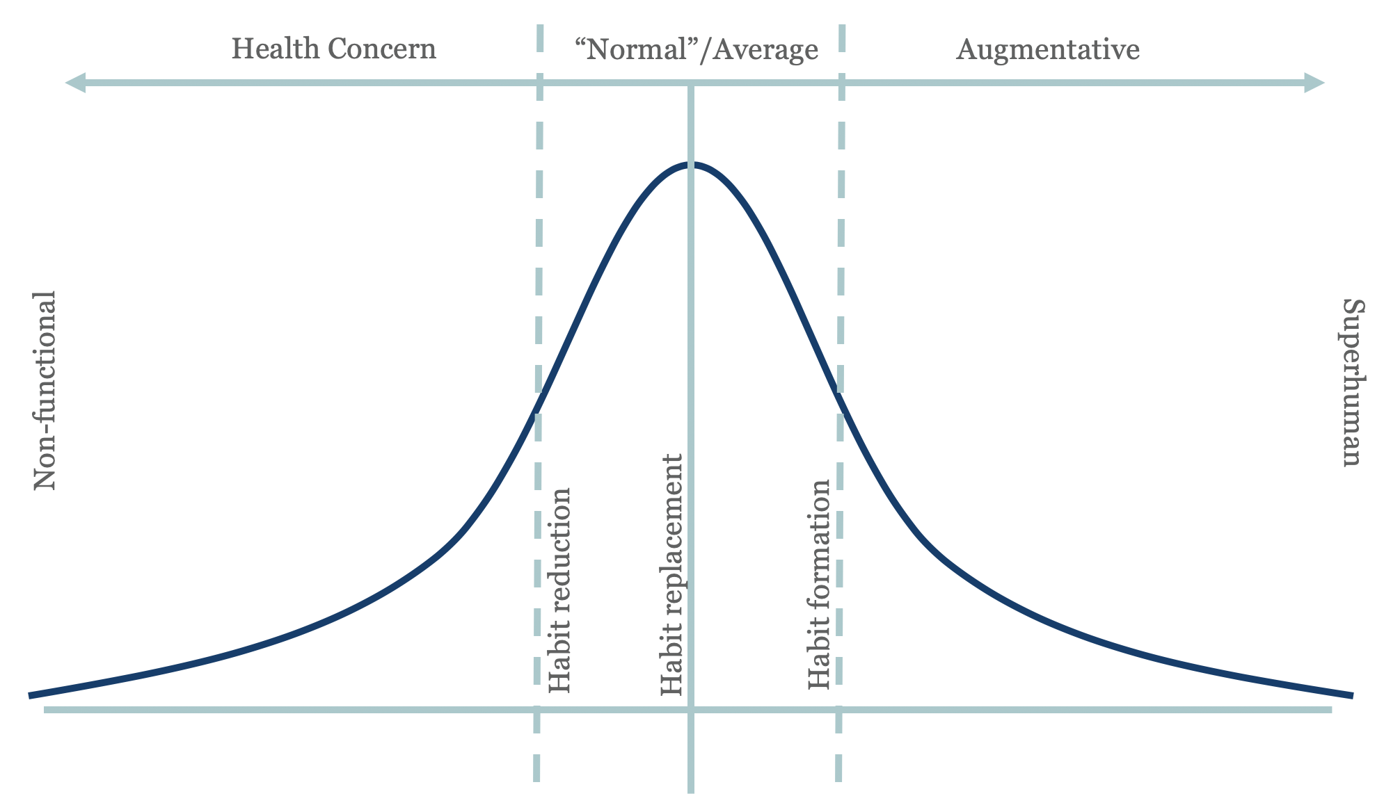 These opportunities can be visualized along a bell curve that describes how addicted someone is to technology. The more addicted someone is to technology, the more dysfunctional or non-functional they are, as represented by the left side of the curve. The more one gives up non-essential tech, the less they are addicted and the more superhuman they become.