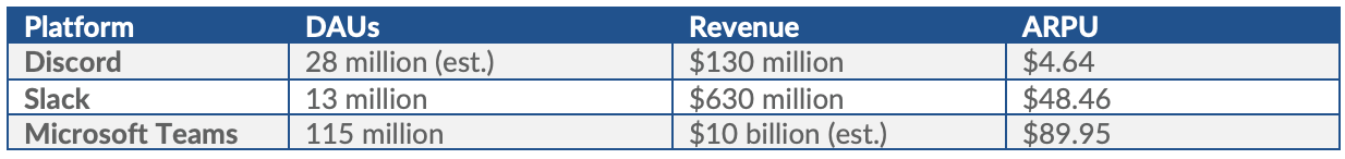 For investors, monetization has been a key question for Discord. If Discord sets itself on the path to become a public company, monetization of its userbase would be the central talking point. Despite the platform’s immense popularity, having 140 million monthly active users, its revenue per user lags its counter parts significantly. Discord reportedly generated $130 million in revenue in 2020. To try to make an apples-to-apples comparison with Slack and Microsoft Teams, who report daily active users, I’ll assume Discord has a 20% stickiness rate, which results in about 28 million daily active users. It’s worth noting that WhatsApp, at the time of its acquisition by Facebook, saw 70% of its monthly users engage on a daily basis. Bumping the stickiness number up would only make Discord’s comparison to Slack and Teams look more discouraging.