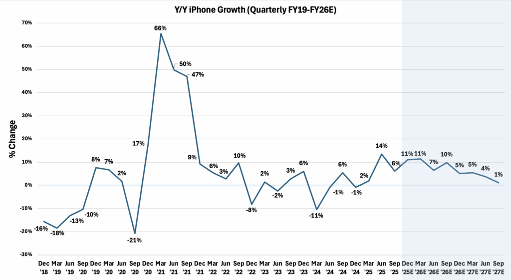 The success of the iPhone 17 cycle sets up challenging comps for the 18 cycle. The Street is expecting 9% iPhone growth in FY26, declining to 5% in FY27.