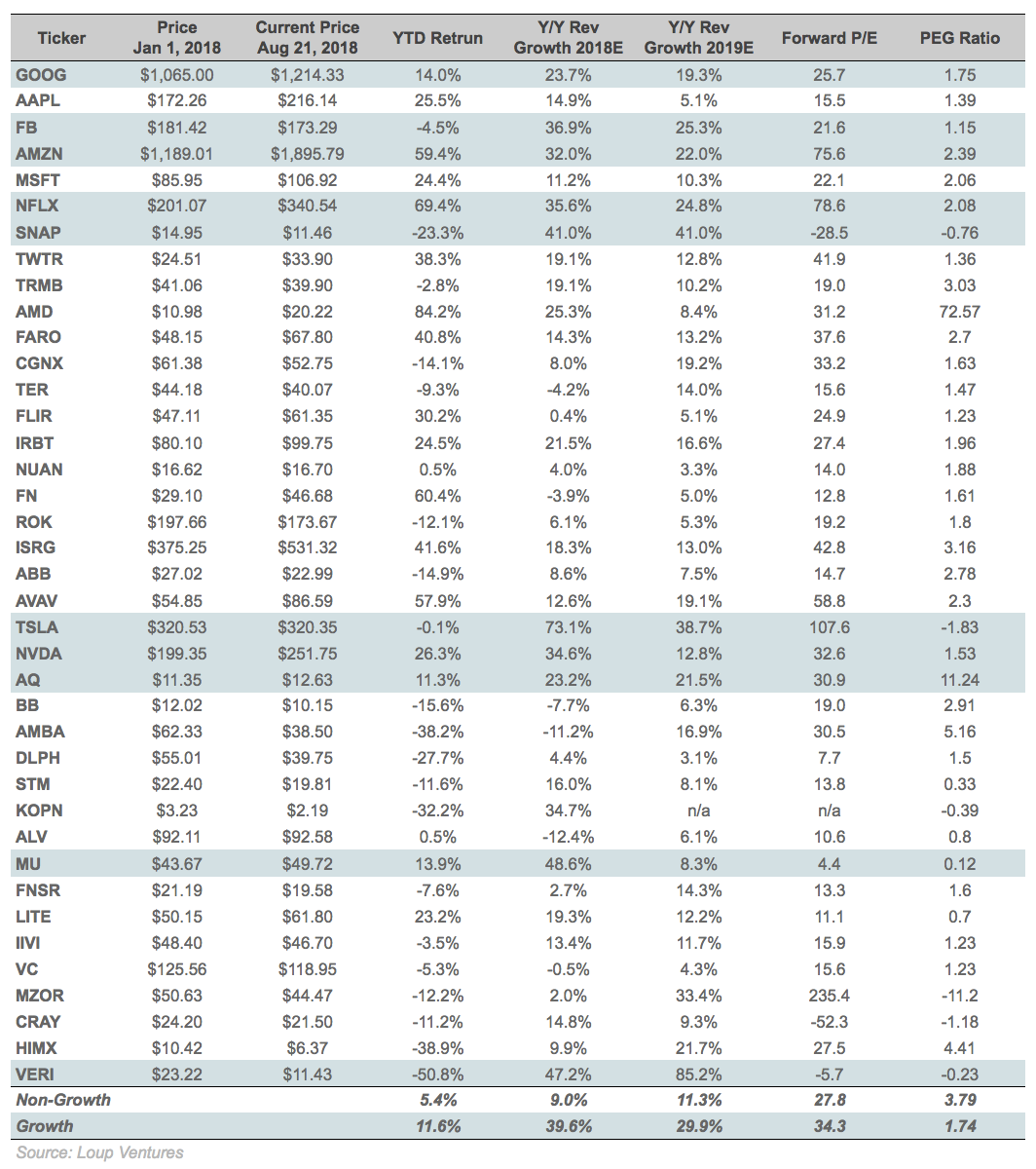 First, we looked at analyst expectations for revenue growth in 2018 and 2019. If they averaged more than 20% they were deemed a growth stock. This yielded 10 growth stocks and 29 non-growth stocks. The “growth” group had an average YTD return of 11.6% vs the “non-growth” group at 5.4%.
