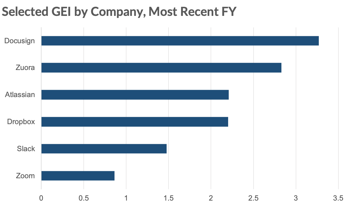 Zoom’s GEI was around 0.86 in FY19, while Slack’s was 1.48 (both have January fiscal year-end dates). These GEI levels compare favorably to other recent IPOs and strong SAAS businesses.